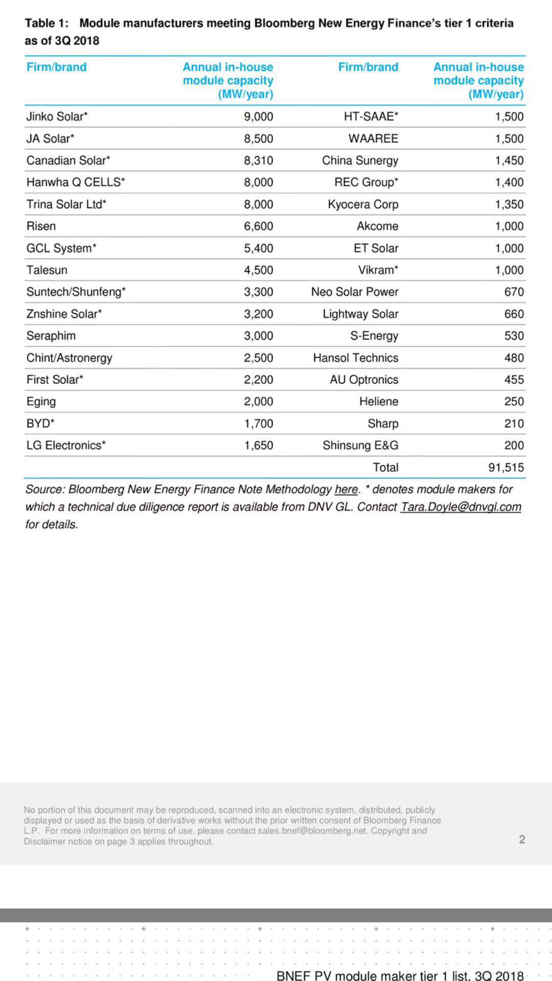 在彭博新能源財經(Bloomberg NewEnergy Finance, BNEF)最新一期2018年第三季度的光伏組件制造商評級體系中,航天機電再次成功獲評一級光伏組件制造商(Tier 1)。